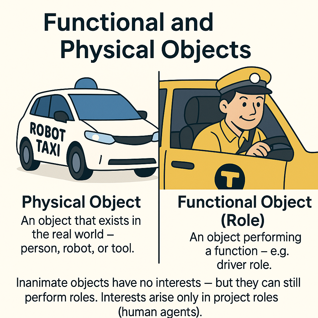 - functional object: this is the role. In the example above, it's the driver role. When we talk about a functional object, we are focusing on the fact that there is not just a physical object, but a role. That is, not just a person, but a driver with a certain level of mastery. In this context, what matters to us is the behavior of this functional object, not which physical object will play this role[2];