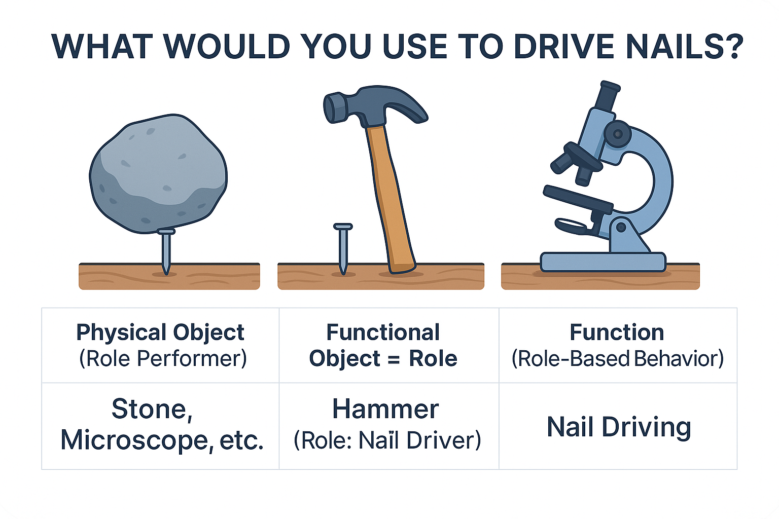 In the previous section, we already discussed the difference between a physical object, a functional object, and functional (or role-based) behavior. For example, a physical object is a microscope[1] or a stone. These objects can play different roles and perform different functions assigned to them by someone. In our example, the functional object or role is the "nail driver." In culture, this role is commonly called a "hammer." The function, or functional or role-based behavior, is driving nails.